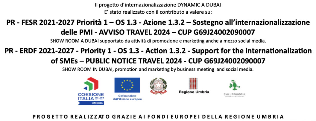 L’azienda ha beneficiato del sostegno dei Fondi POR FESR Umbria 2014-2020 – Az. 3.3.1 - AVVISO PUBBLICO TRAVEL CUP G69J21020370006 – Progetto “NEXT UAE 2022”.